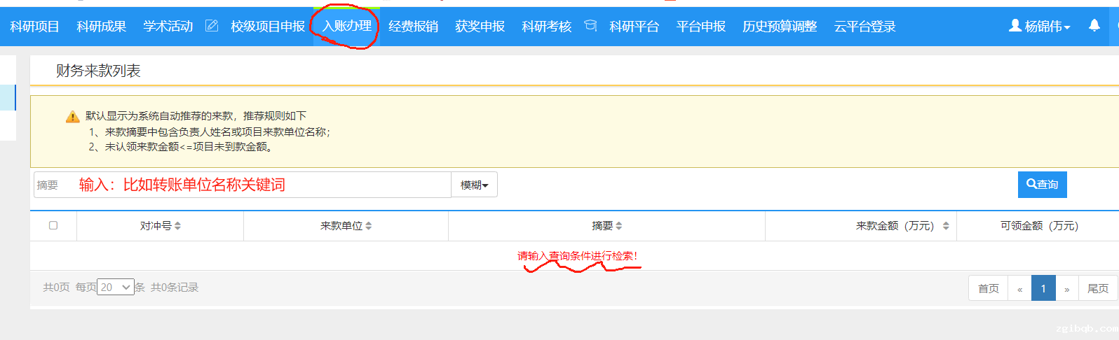 二、“科研系统--入账办理”中,输入:转账单位名称关键词,认领到账经费,在线填写预算书。
